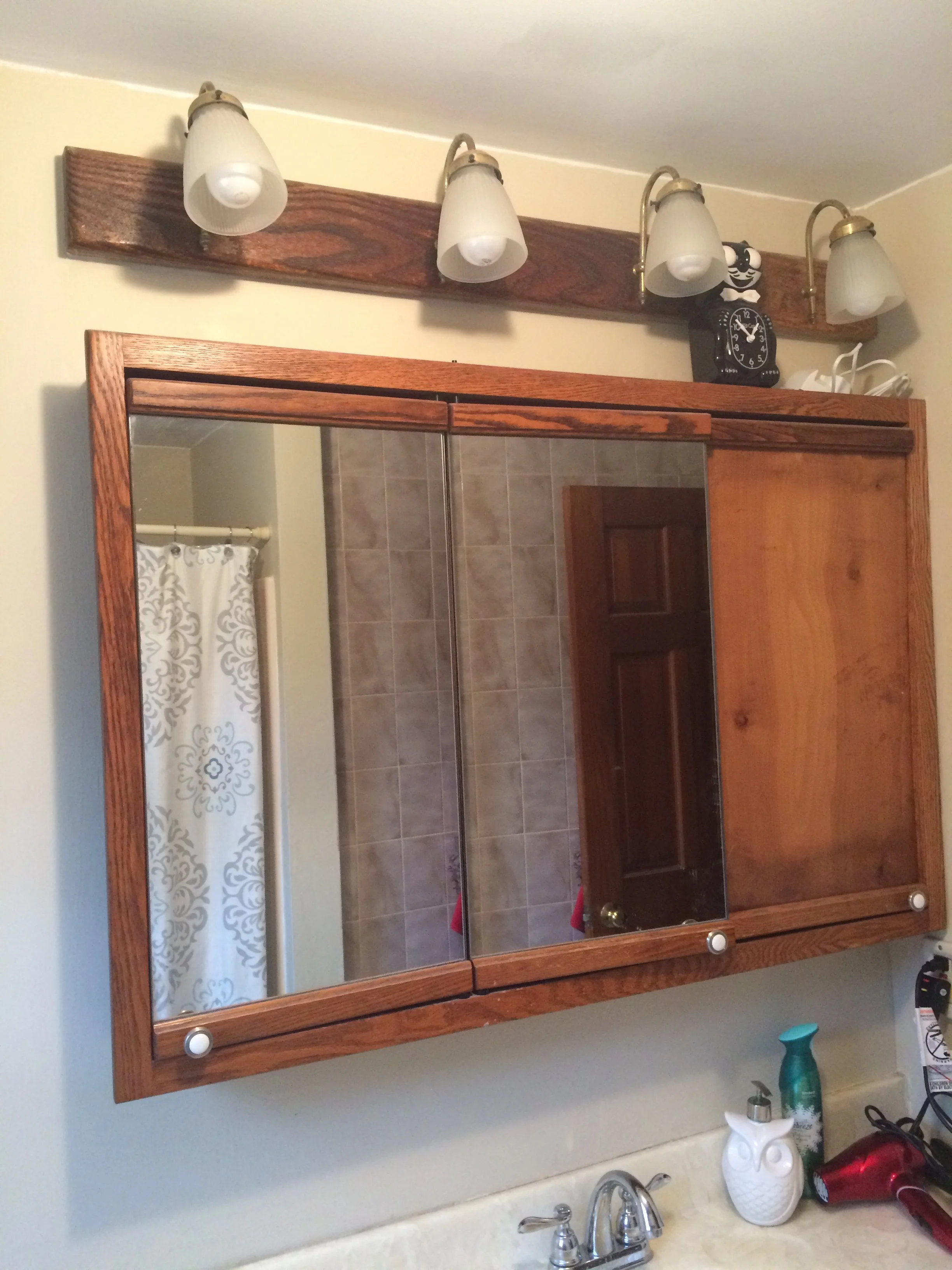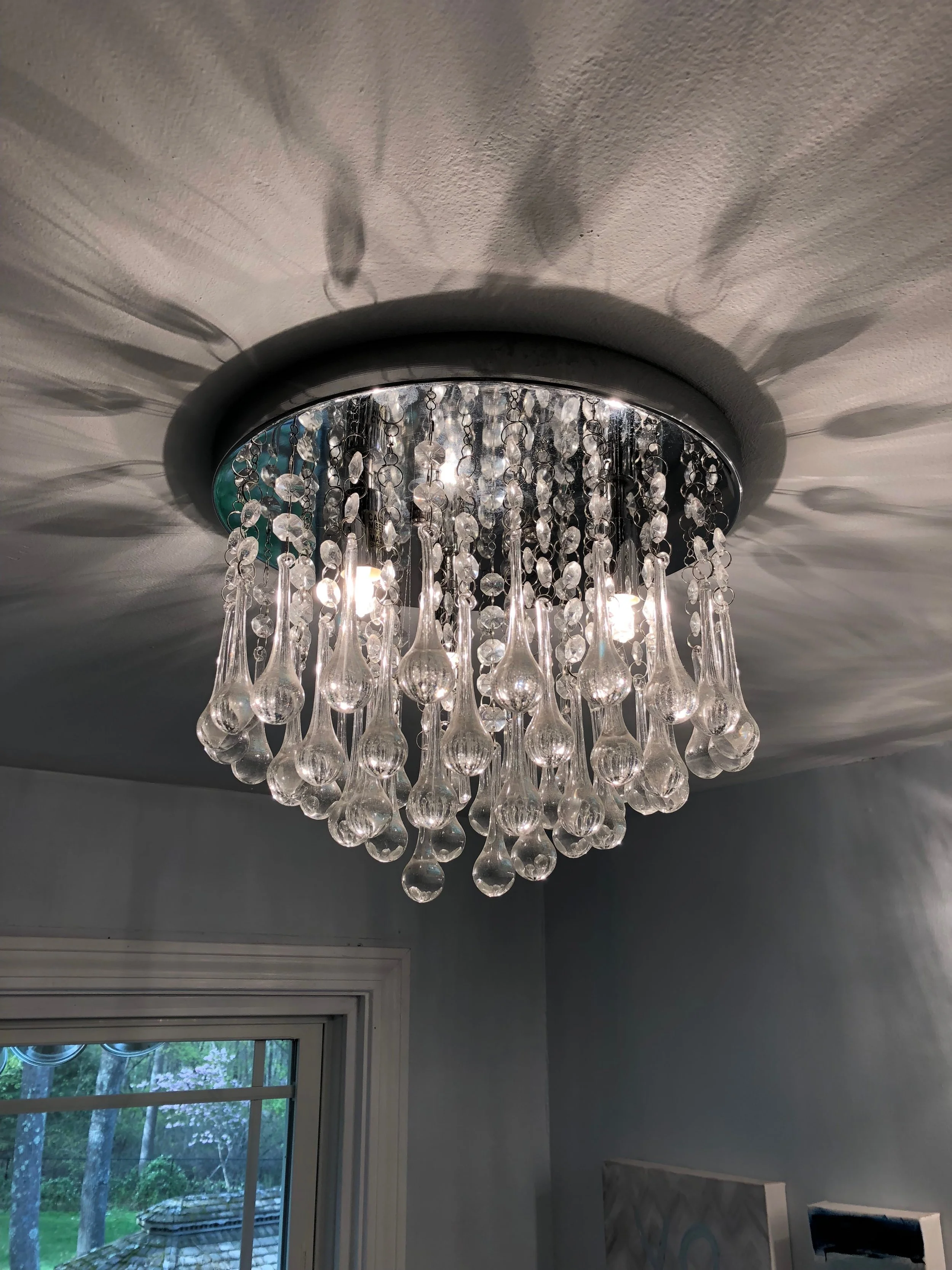 First thing I did was TRASH EVERYTHING. There was nothing worth salvaging here. I then reimagined the space with my daughter in mind, since this would be her bathroom down the road. I wanted to go modern and slightly glam. Not full blown a-guy-wouldn't-be-caught-dead-in-there glam... but flirting with it. Thankfully my husband was a good sport about it and only made fun of the ceiling light a little bit. That glass light, by the way, was damn near free, so I couldn't pass it up. I was working at Wayfair during this reno and with the light being on clearance plus an additional discount, I didn't bother to shop further. It was a bit much, even by the most liberal of estimates, and I often waffle between "oh jesus that's hideous" and "it's kind of fun!" Either way, it's not falling apart so it's an improvement.