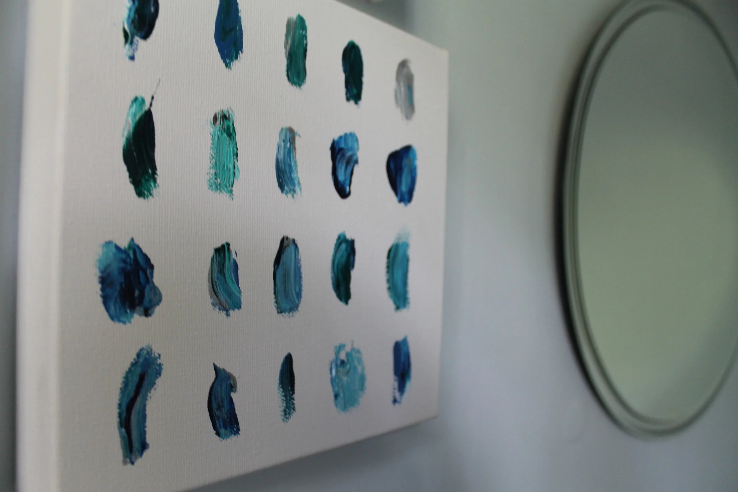 For the floors, I actually hired a professional. They were just in too bad of a shape, plus the subfloor had to be rehabbed. He was worth every penny. We also hired a professional to replace the tub, scrape away the mold, and give us a fresh start. I don't mess around with mold, so this was a worthy expense. I did the paintings myself- they were fun and added a bit of color. The shower curtain came from one of my favorite places on earth, Home Goods. I also got those glass curtain hooks there and felt they complimented the light fixture.
